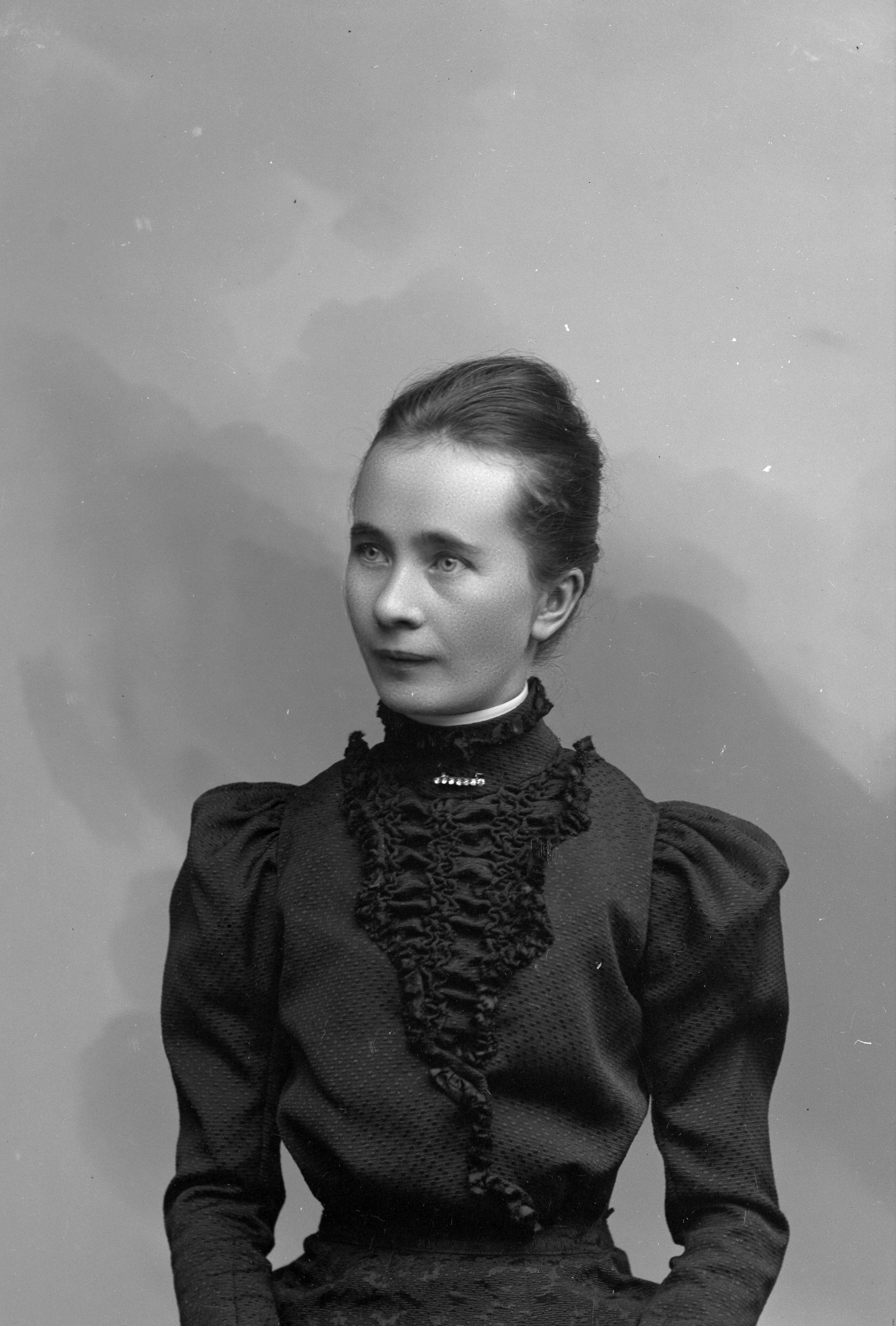 Porträtt i helfigur av Carolina Larsson, sömmerska vid Malmö Gamla Garnbod.