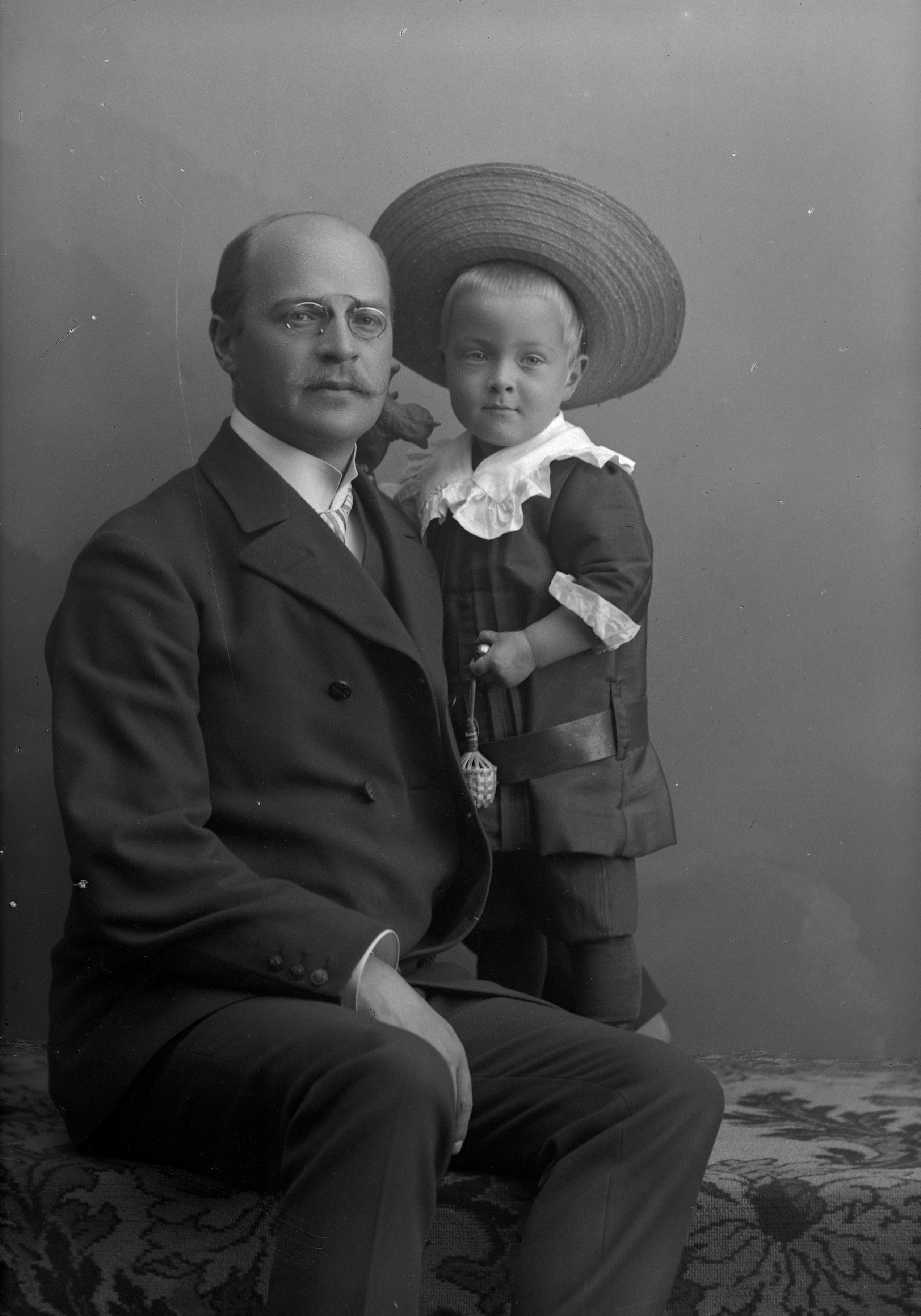 Porträtt i helfigur av Emil Malmsten, disponent vid gödningsfabrik, med sonen Gunnar. Sonen iklädd stor basthatt, hållande leksak.