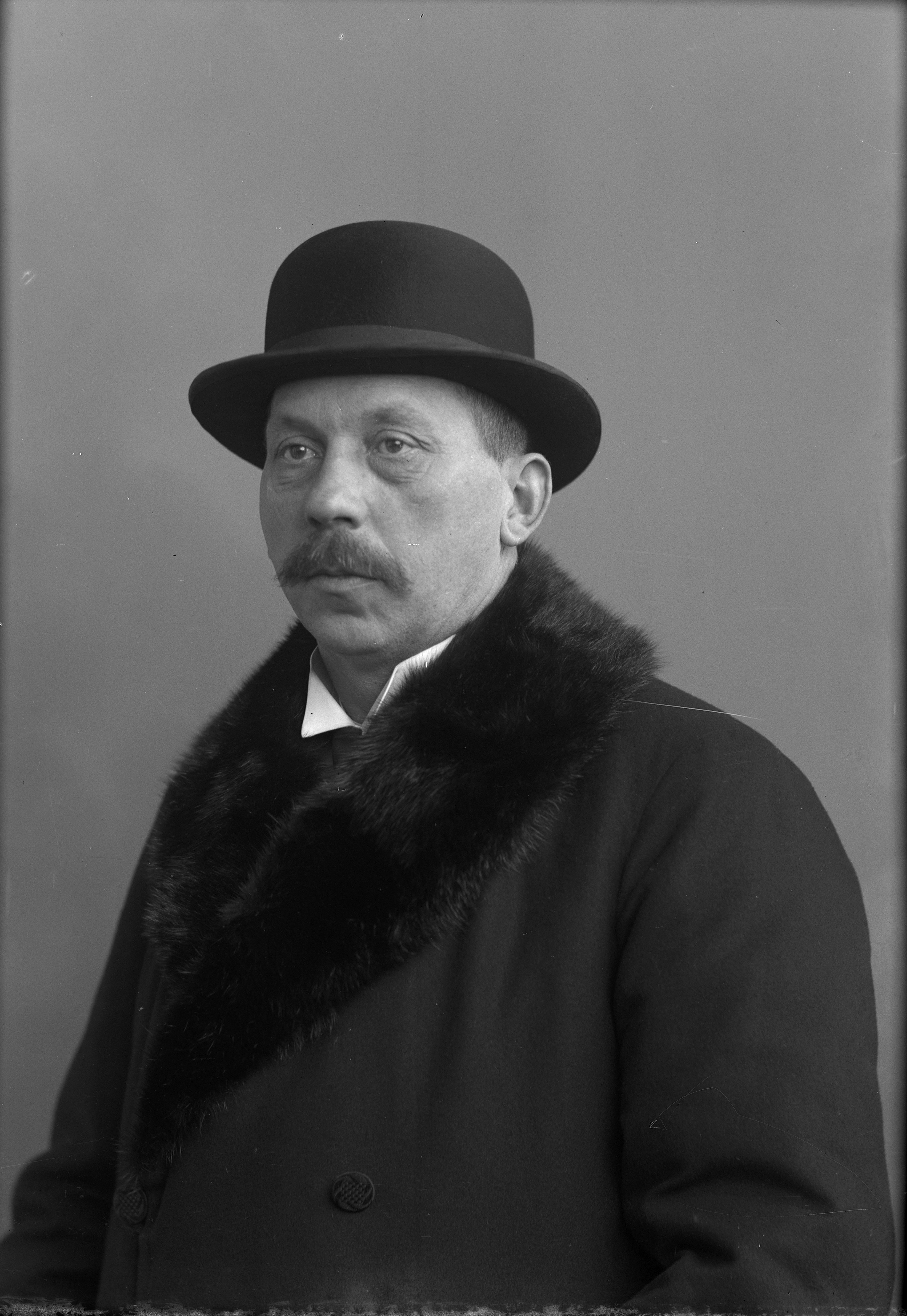 Porträtt i halvfigur av C. P. Källson i hatt och ytterrrock med pälskrage.