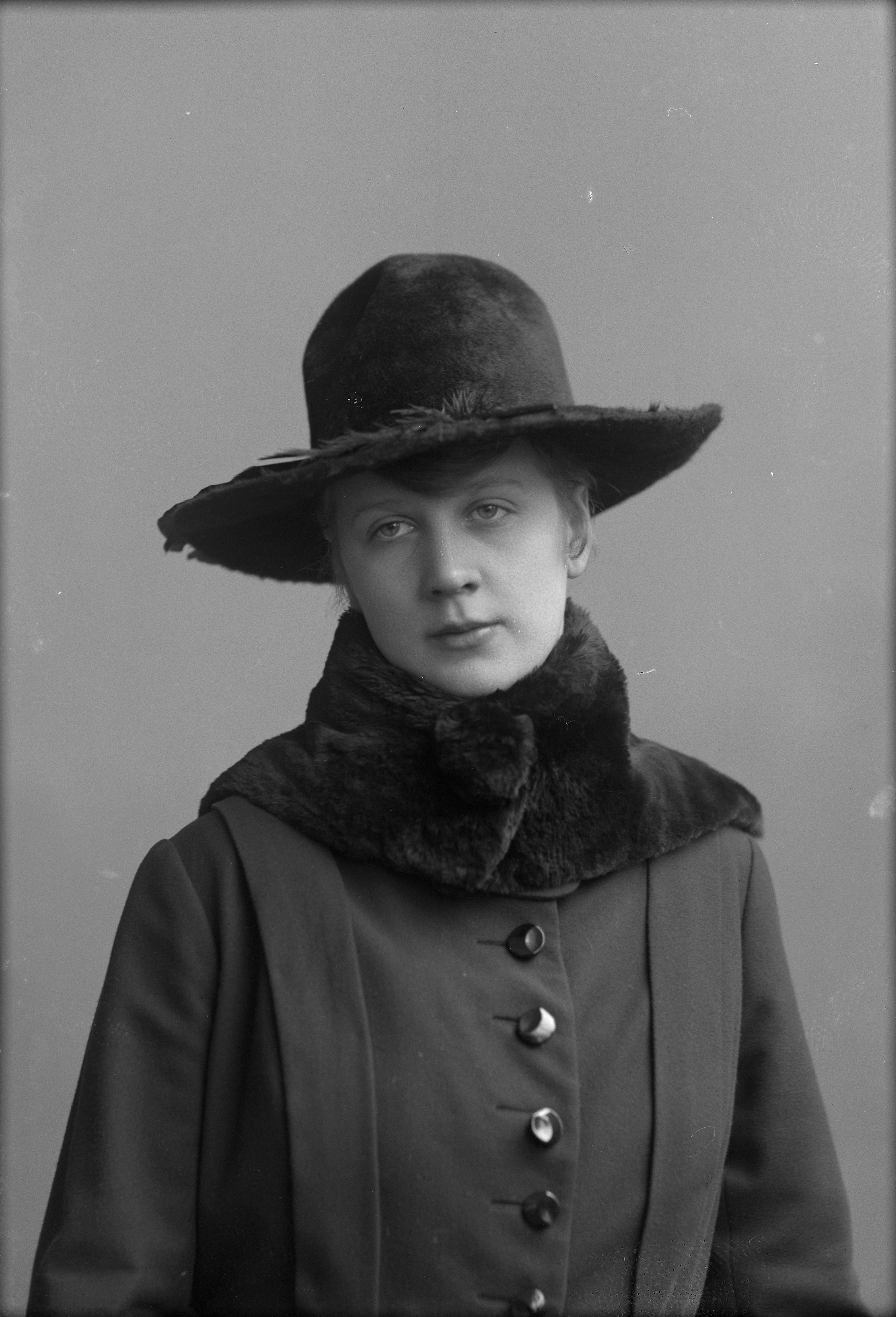 Porträtt i halvfigur av Vera Norberg, iklädd bredbrättad hatt och ytterkappa med pälskrage.