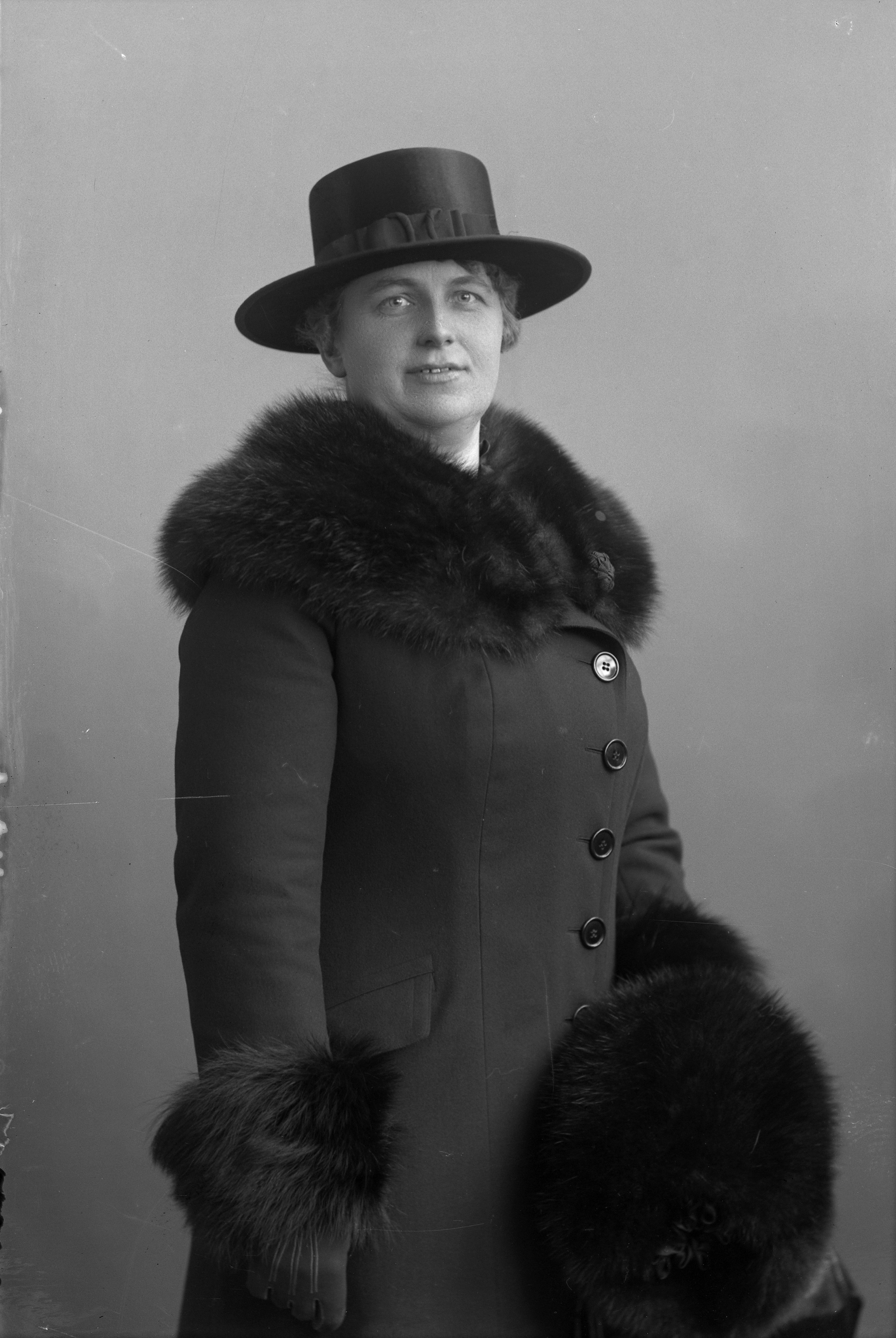 Porträtt i helfigur av fru Nilsson, iklädd hatt och ytterkappa med pälskrage och kring ärmar, hållande handmuff i päls.