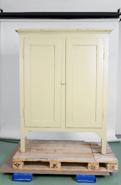 - Köksskåp av fur, överskåp, målat i ljusgult utvändigt. Krön av profilerad list. Saknar baksida. 2 skåpdörrar utan handtag, stänges med vridbar hasp. Invändigt delvis klätt med papper i träimitation och inrett med 3 hyllplan.