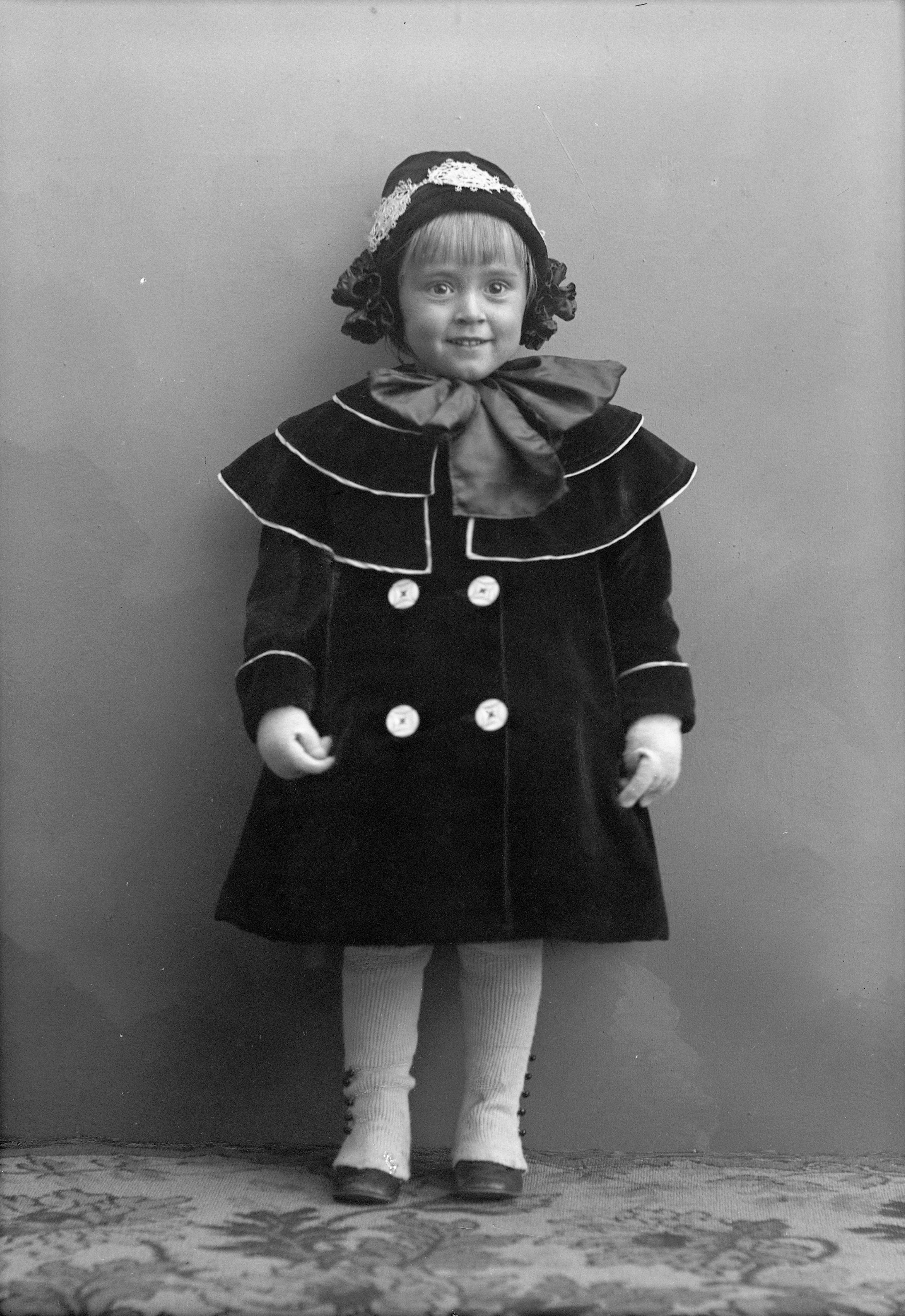 Porträtt i helfigur av herr Bergs dotter, iklädd hätta och ytterkläder.