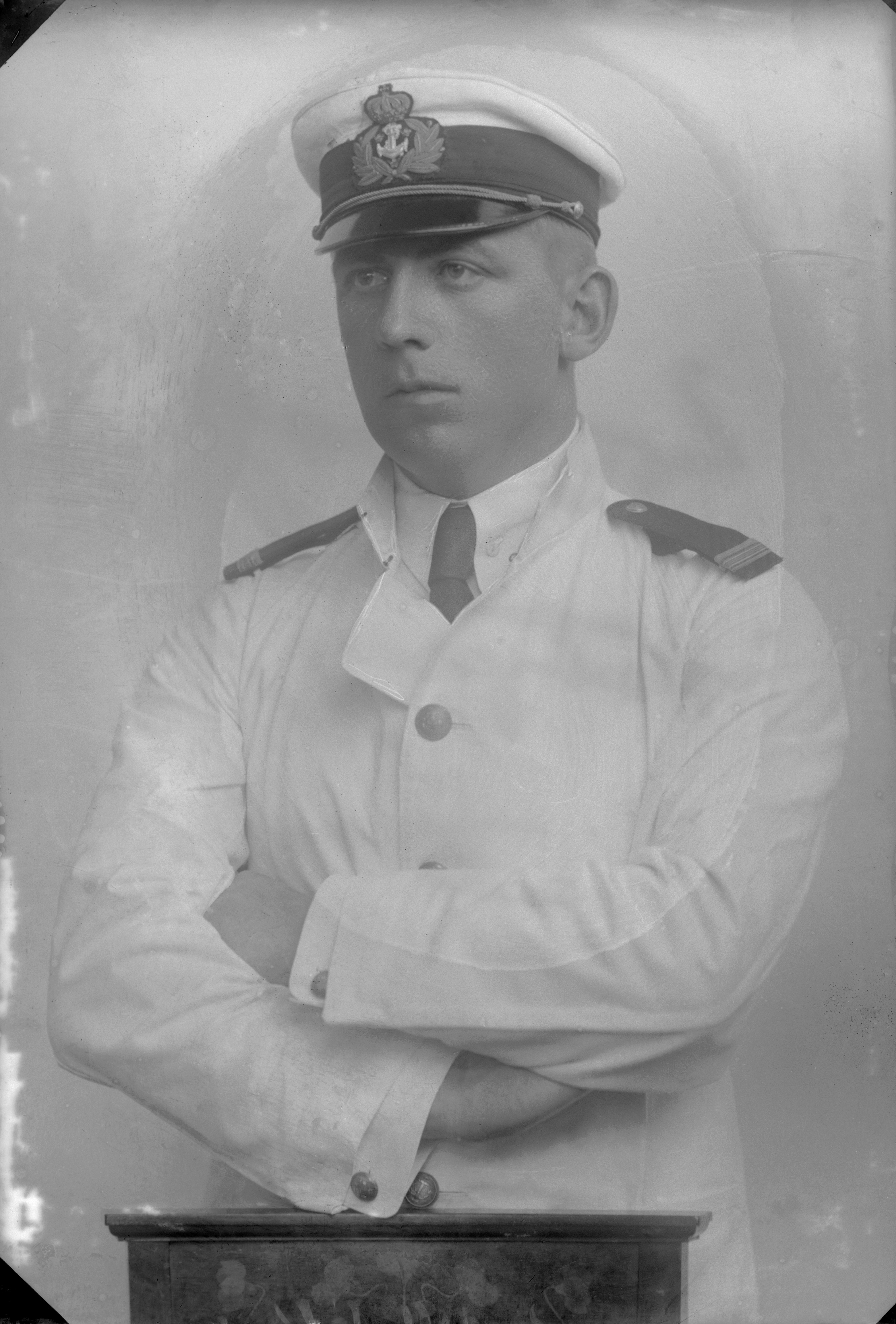 Porträtt i halvfigur av löjtnant Nordquist, iklädd militäruniform och -mössa med emblem.