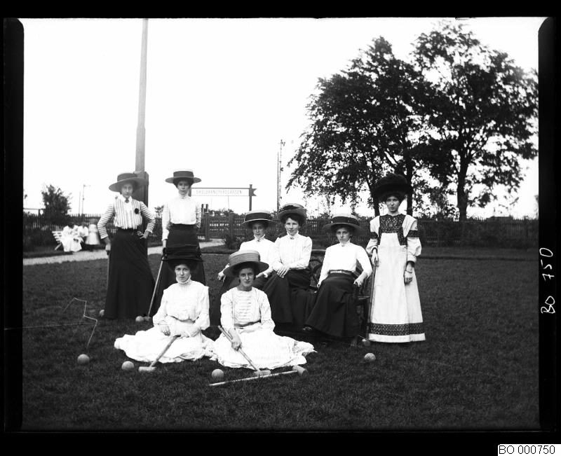 Ett sällskap med kvinnor som träffas för att spela krocket. Kvinnan längst till vänster i bilden heter Ingegerd Eliasson. Bilden tagen i skolbarnsträdgården. Halmstad? 1910-1920-tal?