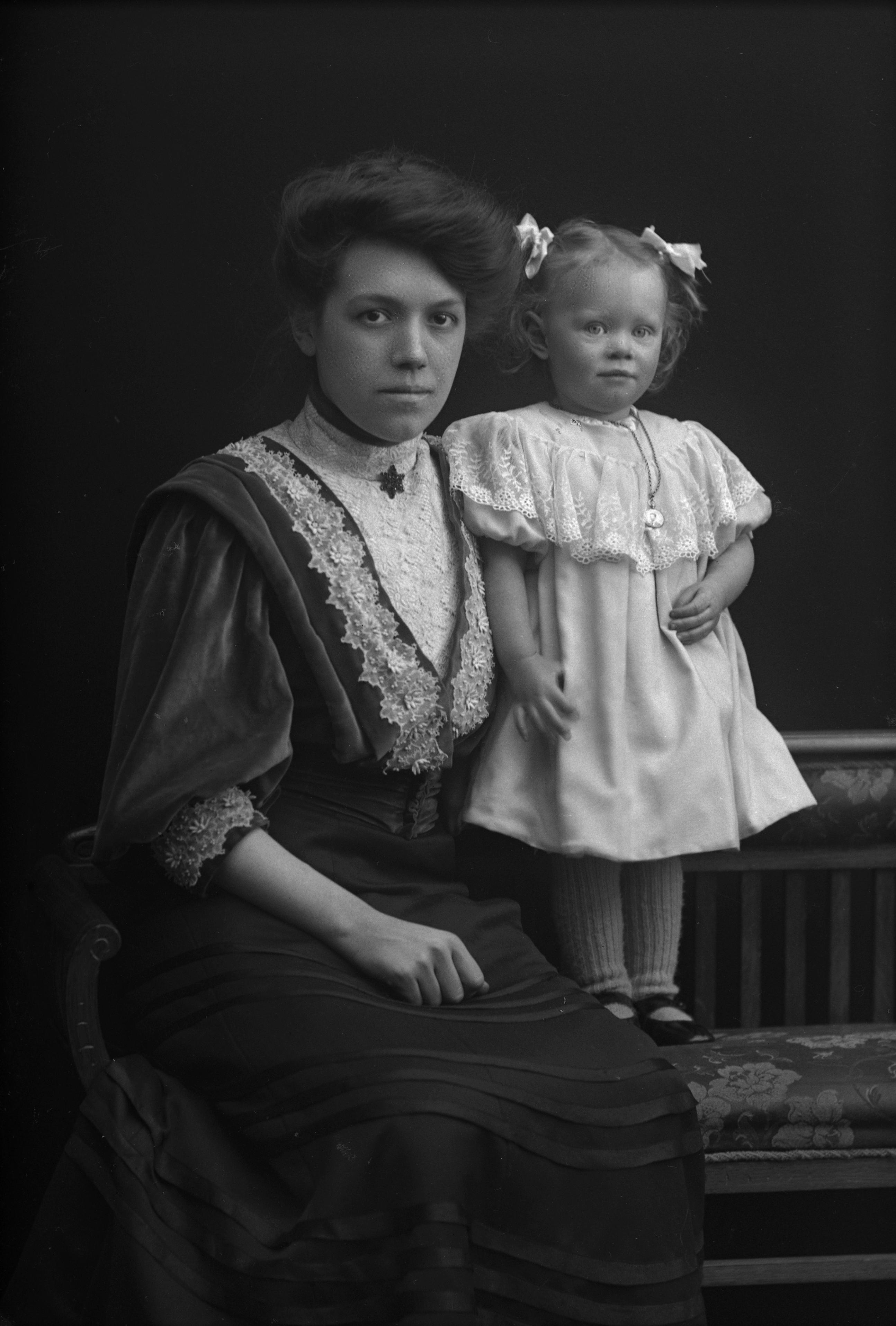 Porträtt i helfigur av telefonisten Svea Gillberg med okänd flicka.