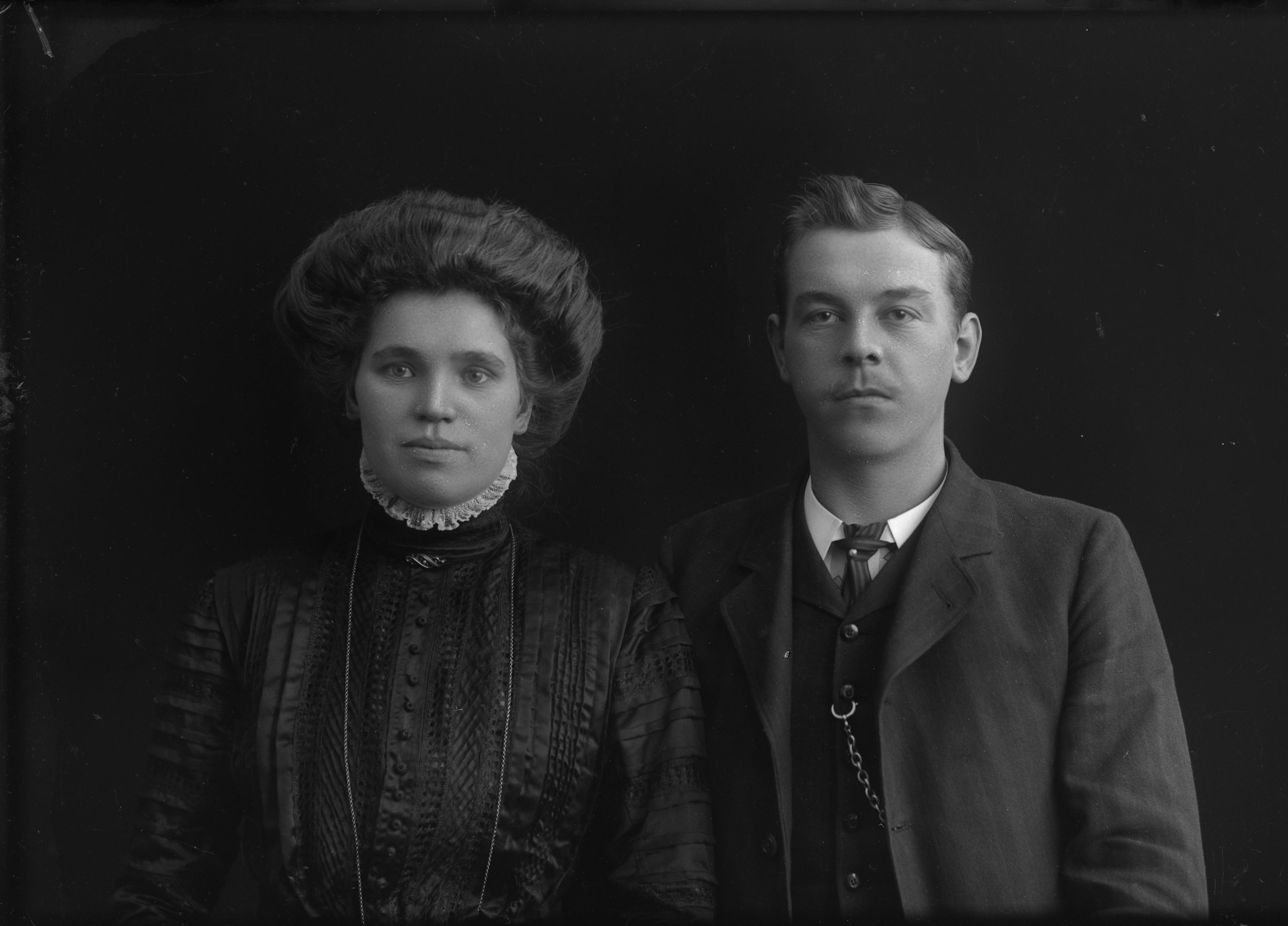 Porträtt i halvfigur av Betty Johansson med okänd man.