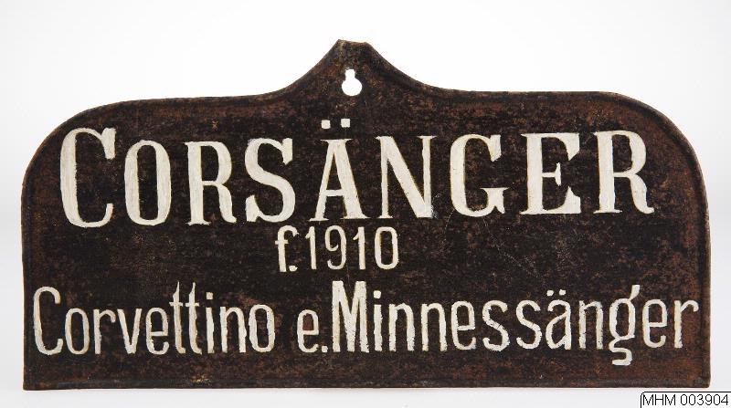 Namnplåt från Strömsholm. Märkt: CORSÄNGER f. 1910 Corvettino e. Minnessänger.