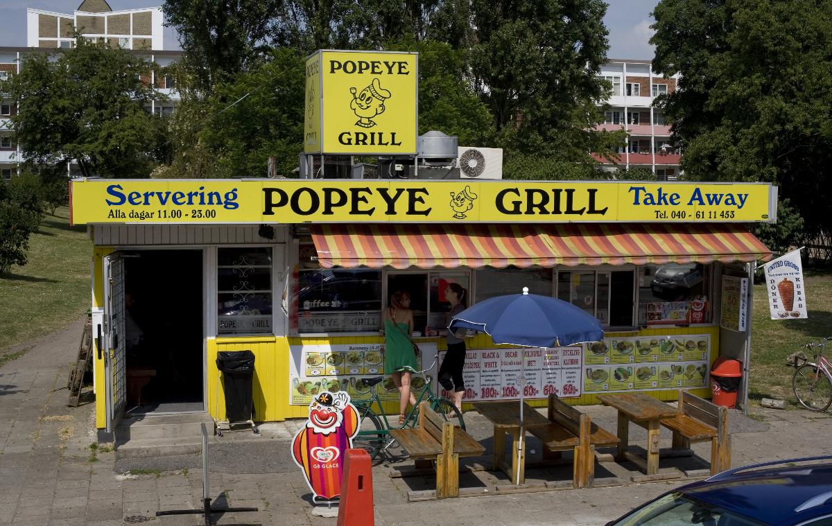 Innerstaden, Malmö, S Innerstaden, Popeye, grill, kiosk, snabbmat, bord, parasoll, GB-gubbe