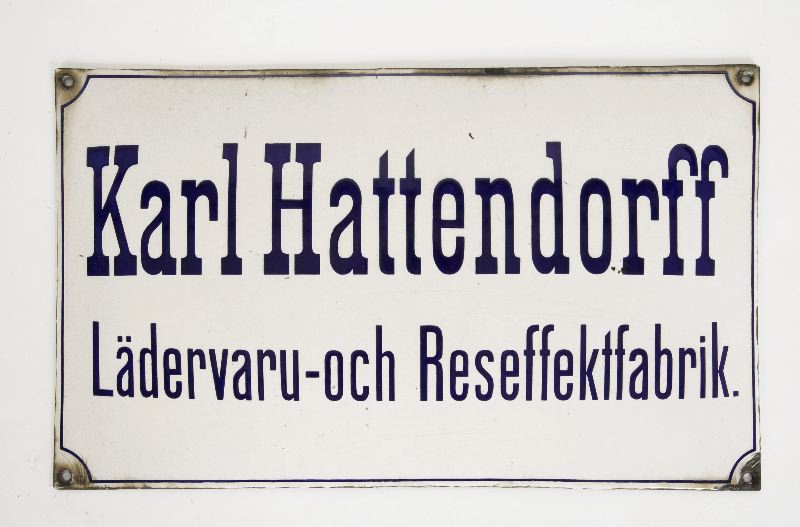 Butiksskylt, fabrikstillverkad med emaljerad plåt. Rektangulär plåt, något bukig, emaljerad på den bukiga sidan. Vit emalj med mörkblå text på två rader och smal mörkblå rand ca 2 mm bred ca 5 mm från ytterkanten. På övre raden står: "Karl Hattendorff" och på undre raden "Lädervaru-och Reseffektfabrik". Övre radens typer är större och annorlunda är nedre radens. I vardera hörnet ett ca 6 mm stort hål för fastskruvning av skylten.