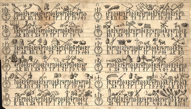 Runkalender, tryck blad, sannolikt uttagen ur Carl Carlesons "Kort och tydelig underwisning, huru man skal förstå och bruka runstafwen, tredie gången uplagd, och med åtskillige anmärckningar, samt ett wackert kopparstycke tilökt." =Anon=. Tryckt i Upsala 1748.