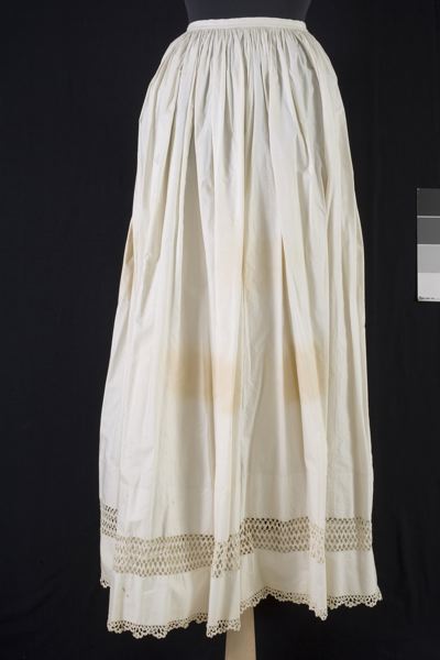 Underkjol av vitt bomullstyg, sydd av fem raka våder. Tätt rynkad med stripade rynkor till en 1,5 cm smal linning, något tätare rynkor bak. Sprund bak med knytband. Nertill är ett 8 cm brett gallerverk av ihopvirkade gansband infällt. Fållen avslutas med en 3 cm bred uddspets av två ihopvirkade gansband.