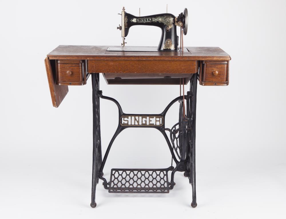 Trampdriven symaskin, Singer, på gjutjärnsstativ. Arbetsbordet med en stomme av fur och ekfanér. Bordet har två draglåder framtill samt på sidan en mindre utfällbar klaff.