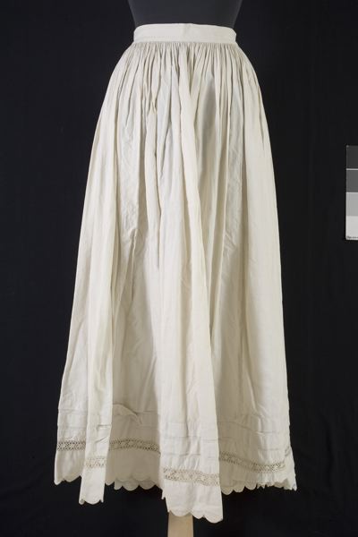 - Underkjol av vit bomullspiké. Tätt rynkad mot en 3,5 cm bred linning. Djupt sprund bak som knyts ihop med långa, vita linneband. Nertill två parallella veck, därefter en infälld knypplad spets, ytterkanten är uddformad, langettsydd. Handsydd.