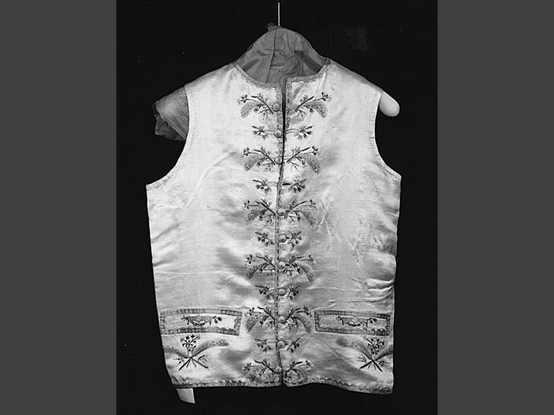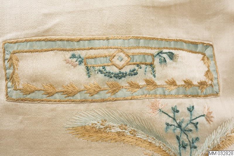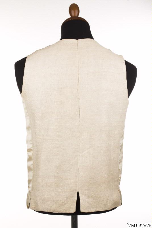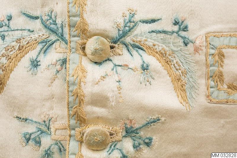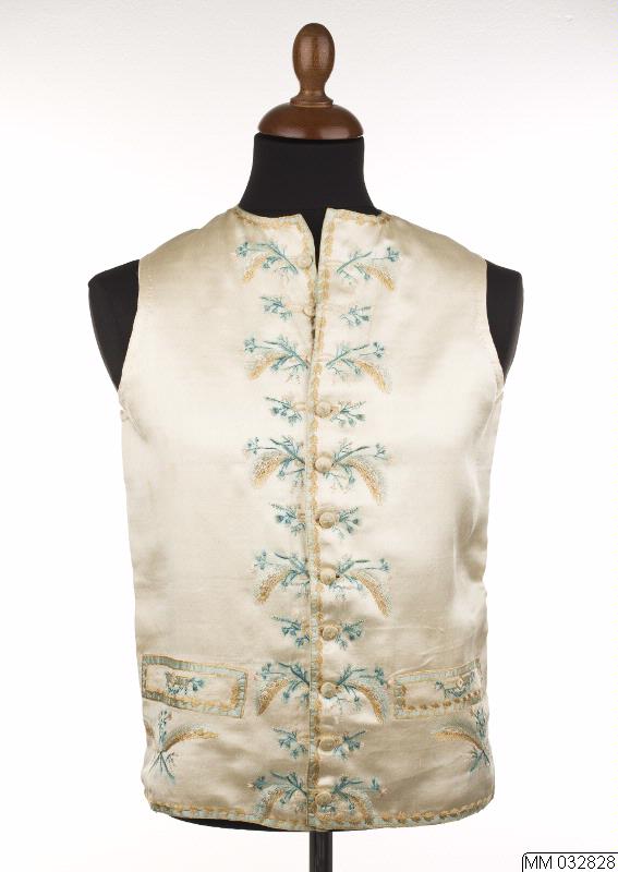 Väst, av vitt atlassiden med broderier med växtmotiv i plattsöm, schattersöm, kedjesöm och knutsöm av gult, rosa, grönt och ljusblått silke samt applikation av ljusblått siden. Ryggstycken och foder av vitt linne. Knäpps med 11 knappar av trä, klädda med vitt siden och med dekor av blomma broderad i ljusblått och rosa silke, knapphål.