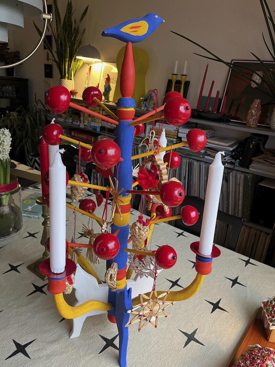 "Det här är ett Julträd från Blekinge. Det är tillverkat av min morfar Edgar Gylling 1980. Traditionen med Julträd är gammal i Blekinge men den här varianten var vanlig i slutet av 1900-talet och såldes på tex hemslöjden. Det är en rotad tradition i min familj att på julen är julträdet lika viktigt som granen! "