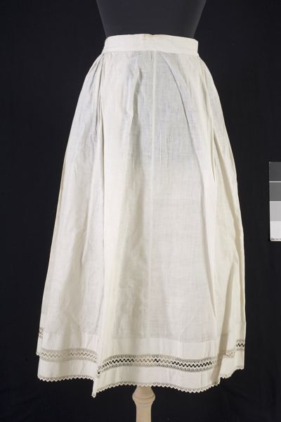 - Underkjol av tunnt, vitt bomullstyg, sydd av 4 raka våder. Slät fram med två djupa veck, rynkad i sidorna och tätt rynkad bak mot en 4 cm bred, möjligen sekundär, linning. Linningen är av tjockare tyg och påsydd med maskin på ett i övrigt helt handsytt plagg. Sprund bak som knyts med två vita bomullsband. Nertill en infälld spets virkad längs två gansband. Nederst kantad med ytterligare en spets virkad längs ett gansband.