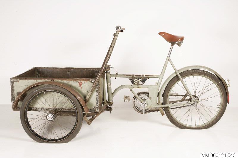 - Trehjulig transportcykel med låda framtill. Röda färgmarkeringar framtill på lådan. Brun cykelsadel. Handbroms, bakljus och ringklocka finns. Framljus saknas. Bakhjulsnav märkt Tornado, Schweinfurt.