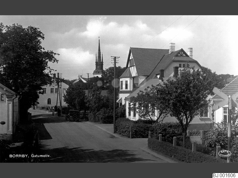 - Gatumotiv från Borrby. Längst till vänster ett kafé och längst till höger ett vägmärke för järnvägsövergång. I bakgrunden Borrby kyrka, invigd 1841.
