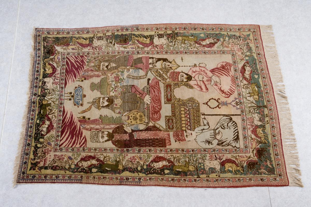 Mattan kantas av en bård med olkia djuravbildningar. Centralmotiv en sittande man, sultan(?) flankerade av två män i en palatsliknande byggnad. Nedanför ytterligare två män.