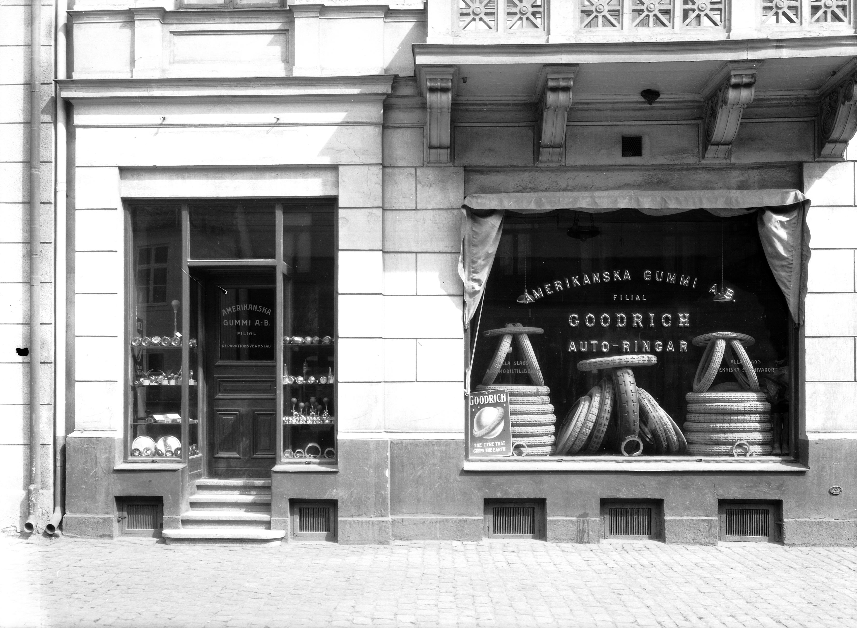 Affär, exteriör, Amerikanska Gummi AB:s filial Östergatan 5 eller Drottninggatan 36