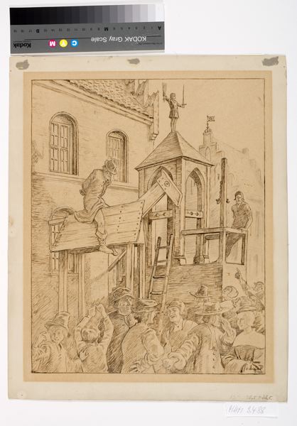 Teckningen visar en äldre man med bakbundna händer sittande på en hög trähäst. Nedanför står en hop åskådare som skrattar och pekar finger åt den äldre mannen. Bredvid trähästen syns ett träpodium med torn, den s.k. kåken med straffredskap. Tornet kröns av en mansfigur med ett svärd i ena handen och ett ris i den andra. På podiet står bödeln. Bakom trähästen syns fasaden av rådhuset